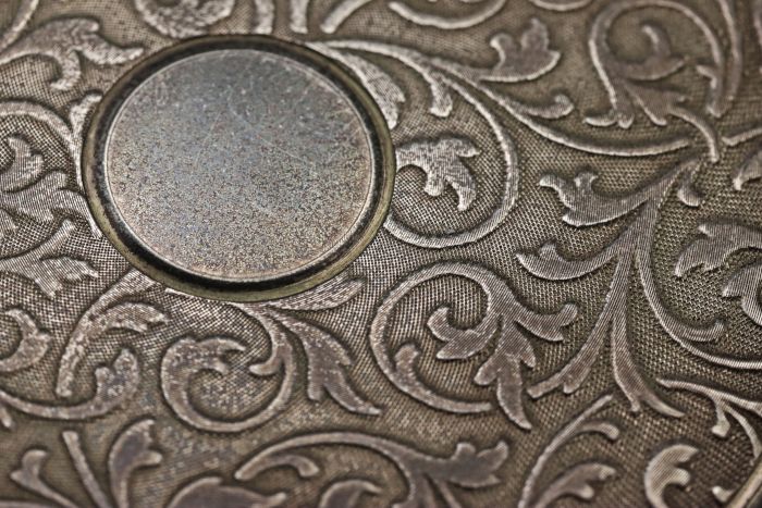 925シルバー製ケースの裏面には、アラベスク調の美しい装飾加工が施されています。