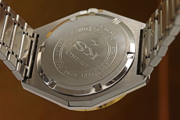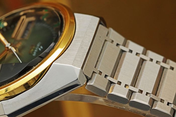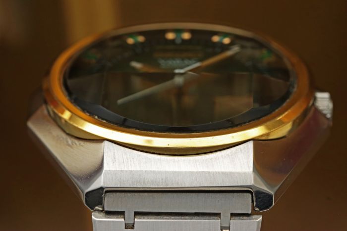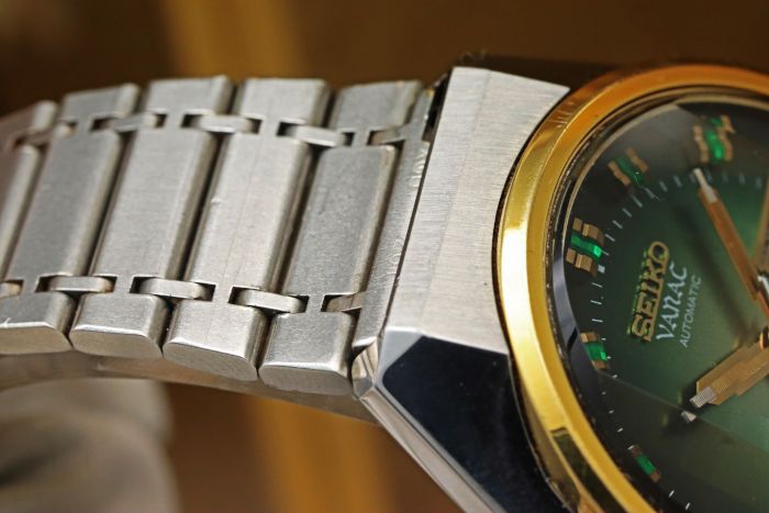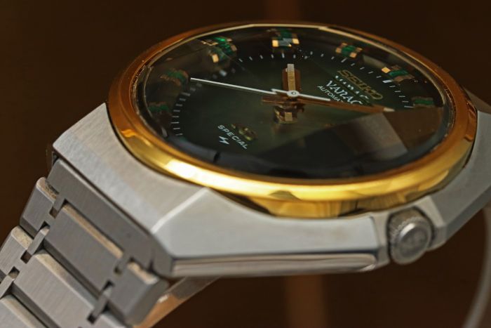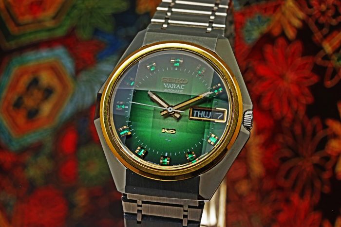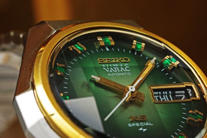 1973年製、セイコーの キングセイコー・バナック Ref.5246-6070 グリーングラデーションダイヤルのご紹介です。70年代のセイコーが若者層に向けて打ち出した高級ライン「VANAC(バナック)」シリーズの一つで、鮮やかなグリーングラデーションダイヤルと、光を立体的に反射する9面カットガラス、さらに精密感あふれるステンレスブレスレットを組み合わせた、当時としては非常に斬新なデザインです。