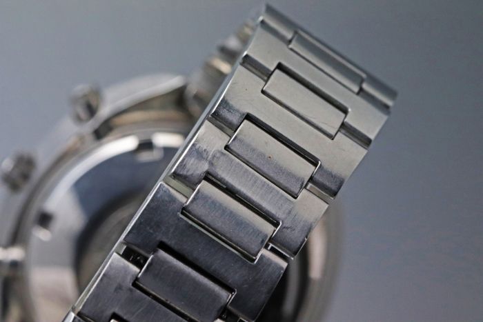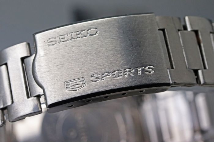 ブレスレットは、「SEIKO 5 SPORTS」刻印バックルを備えたセイコー純正ステンレスブレスレットです。