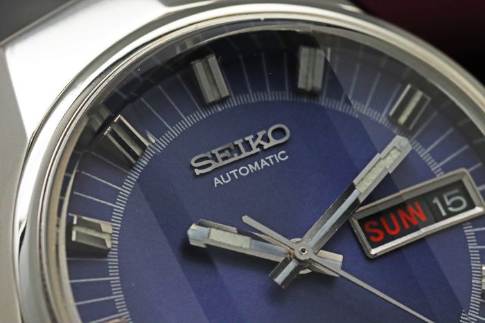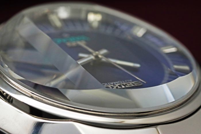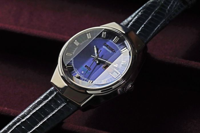 パープルダイヤルに3面カットガラスを組み合わせた、当時のセイコーらしい遊び心と高級感が共存するデザインとなっています。