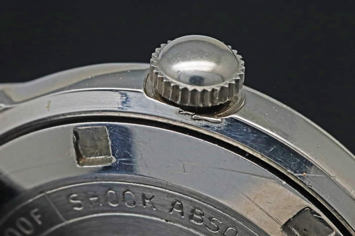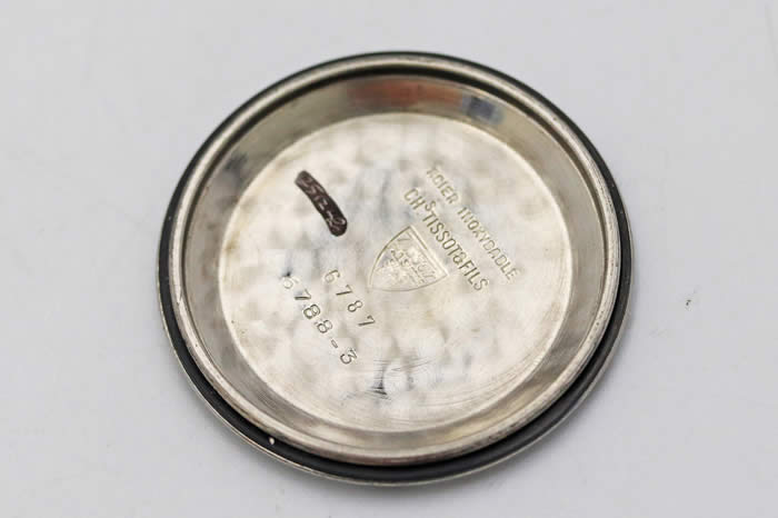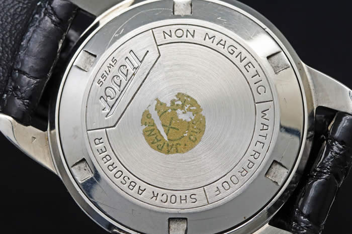 本体ケースは、目立つような大きな傷もなく、全体として綺麗な状態を保っています。裏蓋には、当時の輸入物品税証紙が残っており、当時の雰囲気を感じさせる貴重なディテールです。